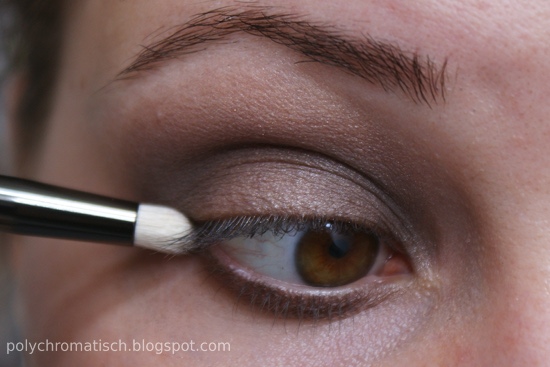 Nun kommen wir zum dunkelsten Ton dieser Variante (3). Diesen nehme ich mit dem gleichen Pinsel auf und gebe ihn ausschließlich auf das bewegliche Lid. Nachdem der Pinsel fast keinen Lidschatten mehr trägt beginne ich die Farbe ganz leicht in die Lidfalte hinauf zu ziehen.